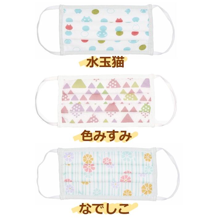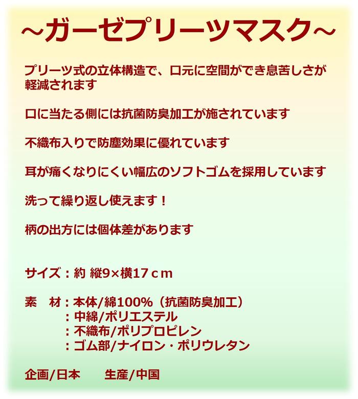 ■ガーゼプリーツマスク 【特徴】 ●プリーツ式の立体構成 ・プリーツのヒダが下を向くように使用して下さい。